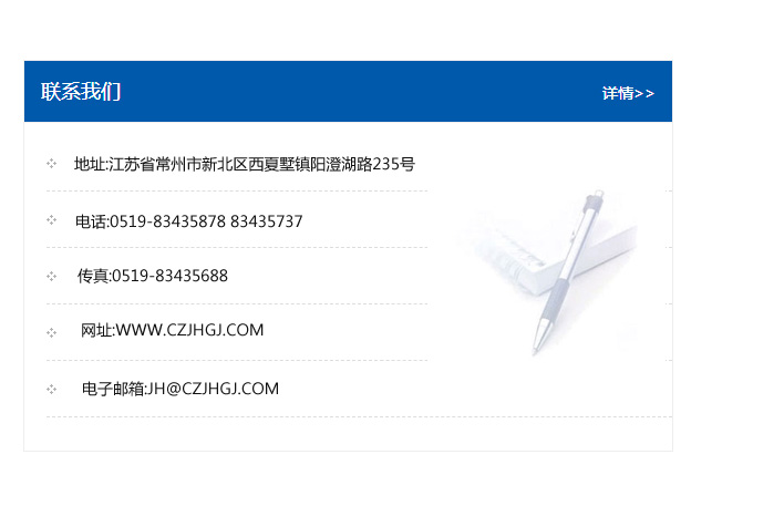 地址:常州市新北區友邦商務大廈1幢16、17層  電話:0519-85101652  傳真:0519-85112595  郵編:213022  網址:www.cz-jiayue_cn.jslykt.com  郵箱:xiajifengaa@163.com